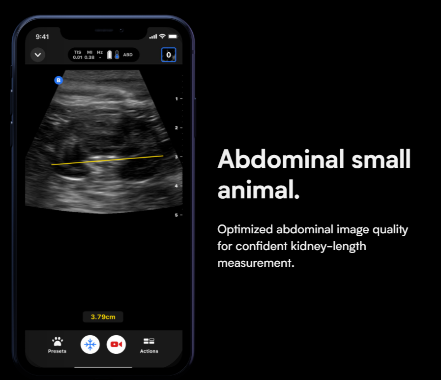 Butterfly iQ+ Vet leverages the power of a Ultrasound-on-chipTM technology pairing with compatible mobile device or tablet. It allows us to adjust the size of the animal being scanned, the depth of scanning, and the field of view, all with ONE PROBE.